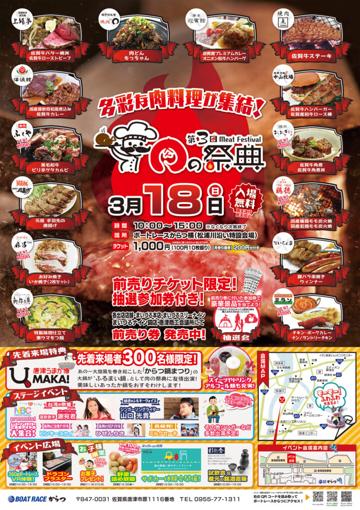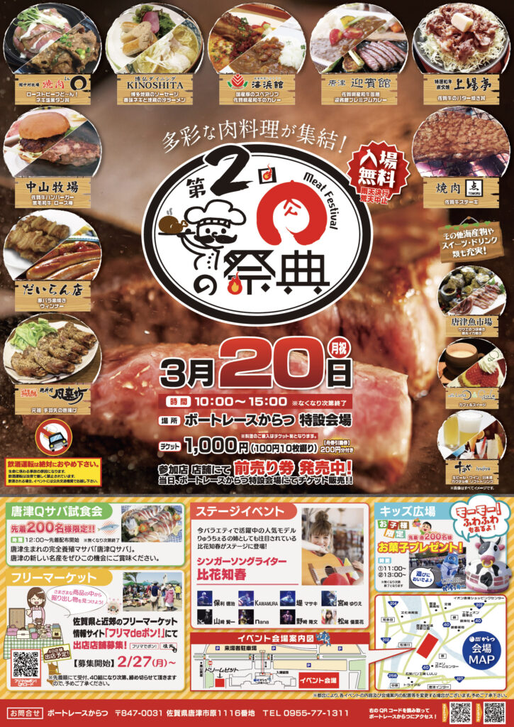 佐賀牛バーガーからローストビーフ丼まで「お肉」を存分に楽しめるほか、40店舗以上が参加となったフリーマーケット、唐津Qサバ試食会など多数のイベント開催が話題となり、2,000人以上が参加する賑わいあるある催事となりました。