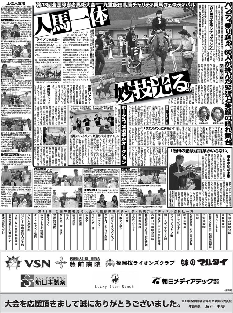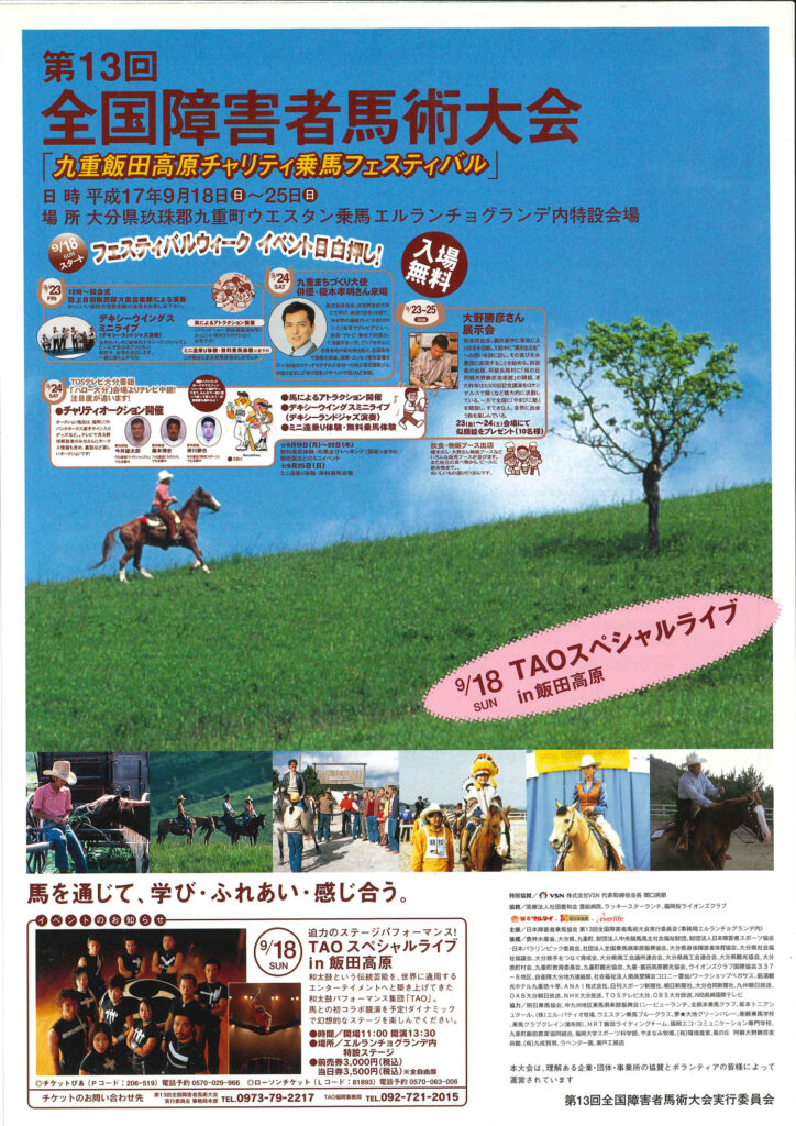 九重町という自然豊かな場所で、「馬を通じて、学び・ふれあい・感じあう」をテーマに、障がいを持つ人や選手への支援を目的にサポートを行いました。当時は九州初の開催で、九州だけでなく全国各地からたくさんの方が集まる大イベントとして多くの方が楽しみ、また学ぶ体験を得られた素晴らしい催事となりました。