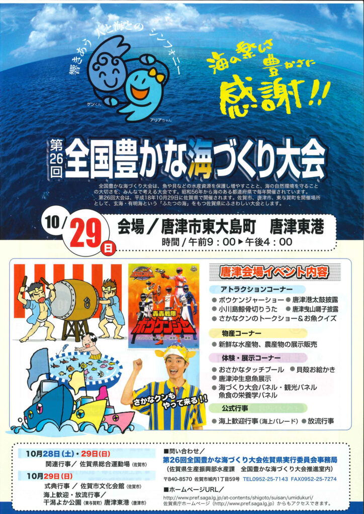 海や貝など水産資源を保護すること、海の自然環境を守る大切さを伝える催事として全国の都道府県で開催していた催事で、佐賀県開催の際に海の街である唐津の一企業としてサポートを行いました。